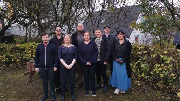 The Student Council. From the left: Secretary Jákup Joensen Eskildsen, SSD, Sigmund Zachariassen, FMD, Chair Harriet Felicia Reistad Dam, NVD, Jóhann Simonsen, NVD, Agnieszka Ryfka, NÁD, Vice Chair Paul Kjartan Matras, SSD, Treasurer Hans Martin Gaard, SSD, and Gretchen MaKayla Rasmussen, NVD. (Erika Dortea Høgnadóttir, SSD, is absent in the photo)