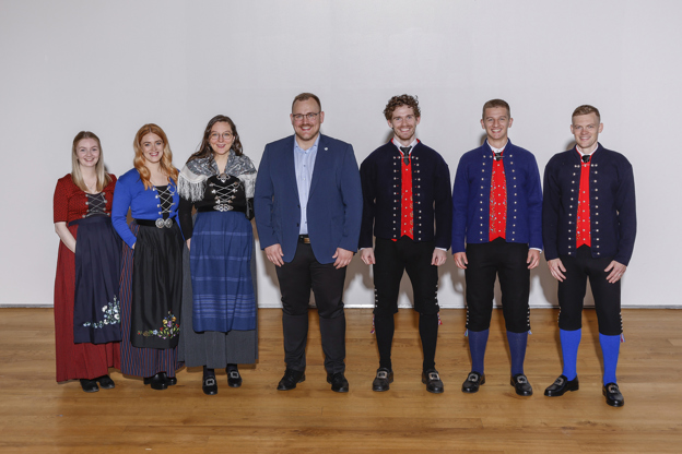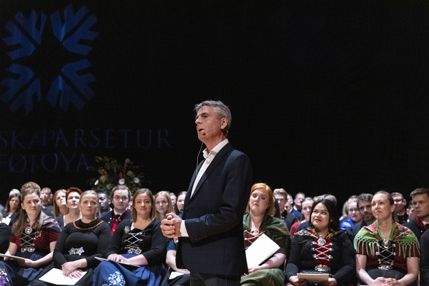 So føgur og fín á pallinum undir bláa búmerkinum hjá Fróðskaparsetrinum