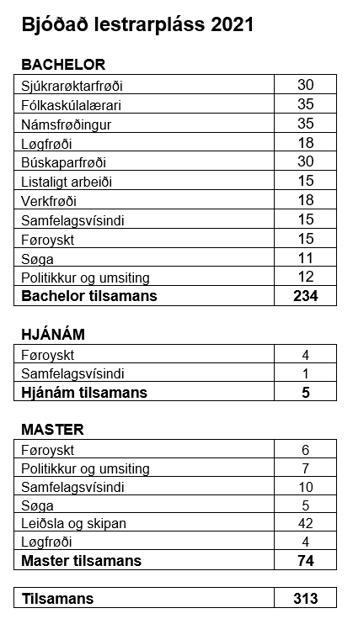 234 menn og kvinnur hava fingið í boði at byrja bachelorlestur, 74 kunnu taka av lestrarplássi á master og fimm á hjánámi.