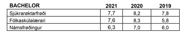Lægsta miðaltal fyri at sleppa upp um gáttina gjøgnum kvotu 1 til tær tríggjar stóru bachelorútbúgvingarnar í sjukrarøktarfrøði, til fólkaskúlalærara og namsfrøðing er nakað lægri í ár, samanborið við í fjør. Tølini niðanfyri eru eftir sjeytalsstiganum.