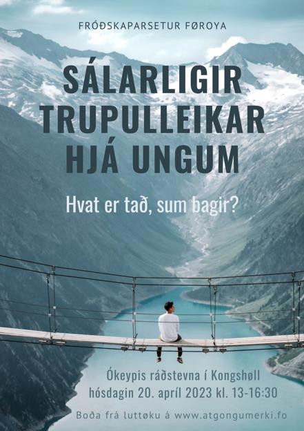 Hósdagin 20. apríl klokkan 13:00 verður ráðstevna á Fróðskaparsetrinum í Kongshøll á Vestaru bryggju í Havn undir heitinum, Sálarligir trupulleikar hjá ungum: Hvat er tað, sum bagir?