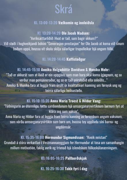 Framløgufólk verða m.a. Ole Jacob Madsen, sálarfrøðingur, heimspekingur og professari, Hermundur Sigmundsson, sálarfrøðingur og professari, Annika Helgadóttir Davidsen, sálarfrøðingur, og Monika Mohr, kandidatur í heilsufremjan.