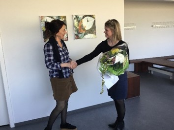 Jórun Petersen, leiðari á Heilsuskúla Føroya, handar Monu við Reiðlið blómuheilsan eftir lokið prógv