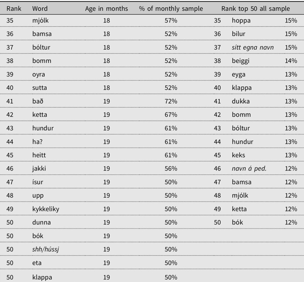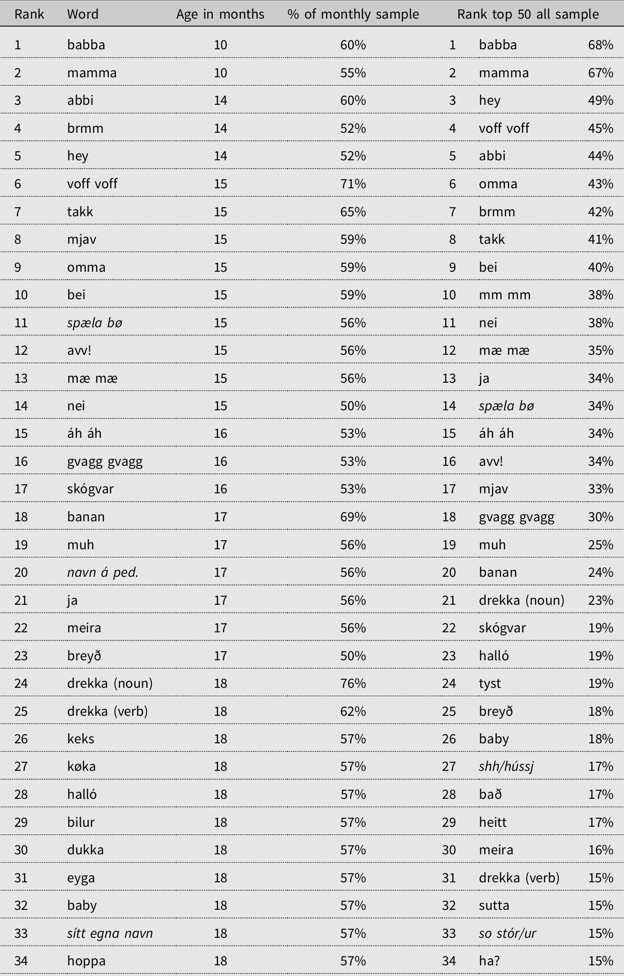 Í greinini er ein listi við 50 teimum fyrstu orðunum, sum føroysk børn duga at siga. Greinin vísir eisini, hvussu føroysk børn læra orð samanborið við børn í londum kring okkum, og fyrstu orðini hjá føroyskum børnum og enskum børnum vera samanborin.