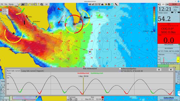 Myndin vísir her dømi um, hvussu skipanin roknar viðstreym (grønt) ella mótstreym (reytt) eftir ætlaðari siglingarleið