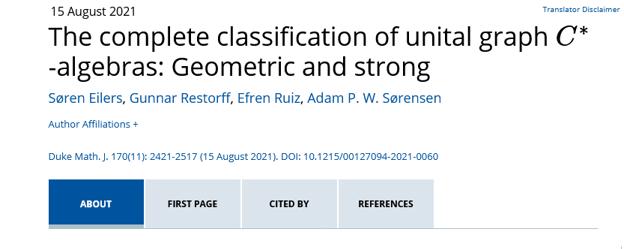 • Eilers, Søren; Restorff, Gunnar; Ruiz, Efren; Sørensen, Adam P. W. The complete classification of unital graph C -algebras: Geometric and strong. Duke Math. J. 170 (2021), no. 11, pp. 2421–2517. DOI: 10.1215/00127094-2021-0060