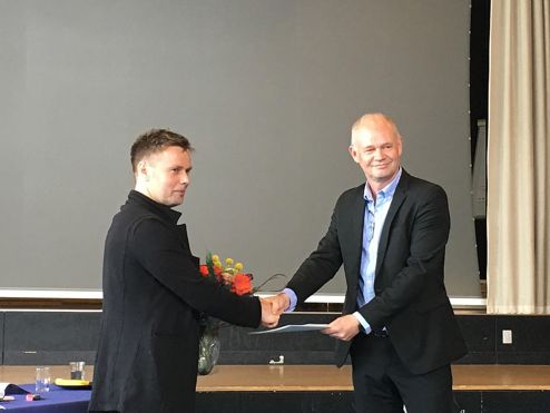 Her hevur Hans júst staðið sína ph.d.-verju og fær prógv og blómur frá Sigurð í Jákupsstovu, sum tá var rektari á Fróðskaparsetri Føroya