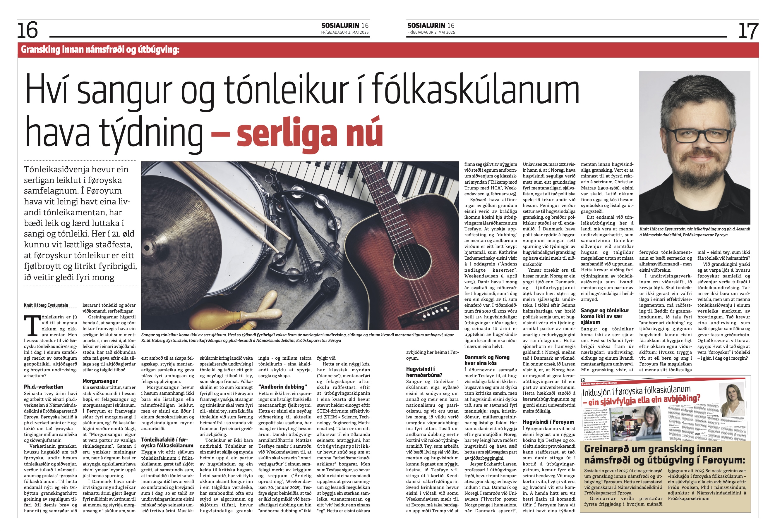 Tónleikasiðvenja hevur ein serligan leiklut í føroyska samfelagnum. Í Føroyum hava vit leingi havt eina livandi tónleikamentan, har bæði leik og lærd luttaka í sangi og tónleiki. Hetta skrivar Knút Háberg Eysturstein hesa ferð um í greinarøðini, sum Sosialurin hevur í ár um gransking í námsfrøði og útbúgving í Føroyum