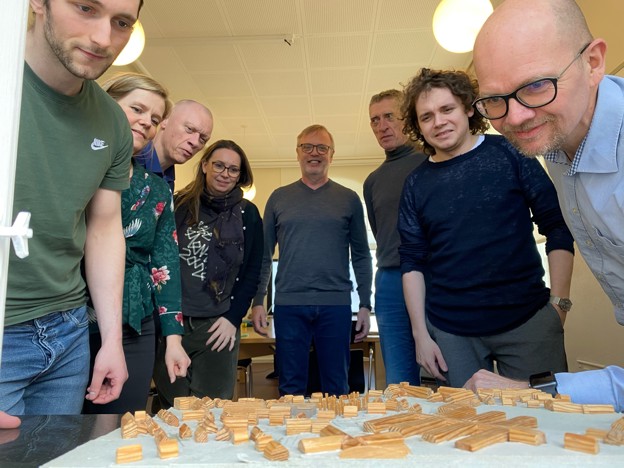 Umboð í kampusbólkinum og rektarin á Setrinum skoða tað elsta modellið av setursbýlingi, sum stendur í vindeygakarminum í Gróthúsinum, har Setursskrivstovan heldur til