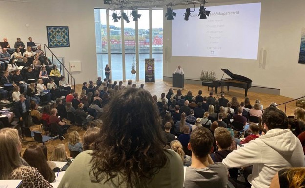 Tað var hugaligt hjá Chik Collins, rektara, at bjóða so mongum nýggjum lesandi vælkomnum í morgun (Foto: Brynhild Thomsen)
