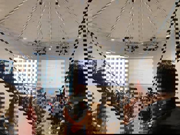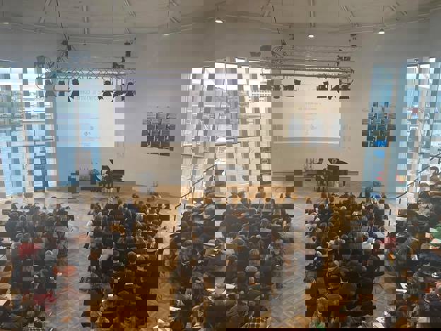 So mong vóru møtt, at rektarin mátti biðja húsavørðin um at heinta fleiri stólar. Her hevur Chik Collins fingið eyga á eitt tómt pláss í erva og roynir at stýra streyminum rætta vegin