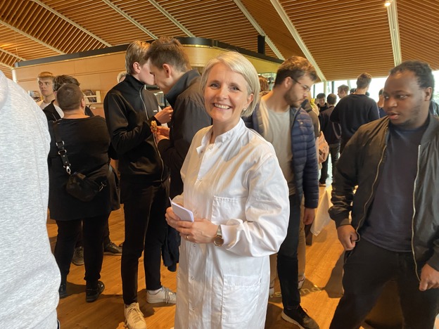 Starvsfólk á Setrinum minglaðu eisini millum tey ungu og greiddu frá lestrarmøguleikunum á Føroya einasta universiteti. Her er tað Jónrit Halling, útbúgvingarleiðari, sum í hvítum kittli dyrgir við spennandi lívfrøði, sum er hennara fakøki