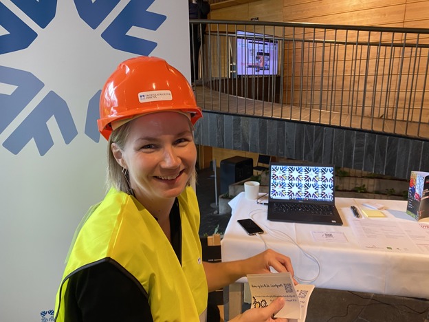 Og undir reyðgulum hjálmi og í vesti agiteraði Eyðbjørg Amanda Petersen, verkfrøðingur, sjálvandi fyri verkfrøðini, sum er útbúgving á Náttúruvísindadeildini