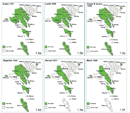 - tit nakrantíð hava hoyrt um, at mýs hava verið aðrastaðni enn í teimum 6 oyggjunum, tær eru á í dag (Fugloy, Mykinesi, Nólsoy, Hesti, Sandoy og í økinum kring Tórshavn)