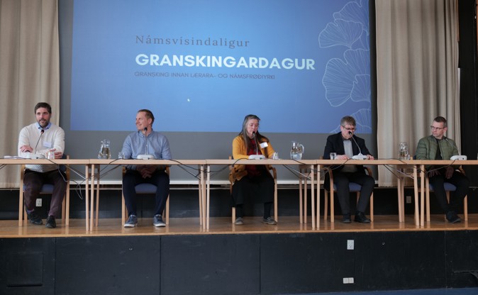 Við pallborðið sótu: Erla Olsen, dekanur á Námsvísindadeildini, Høgni Warberg, fulltrúi í Barna- og útbúgvingarmálaráðnum, Eyðun Gaard, stjóri á Námi, Jógvan Philbrow, formaður í Føroya Pedagogfelag og Tórhallur við Gil, næstformaður í Føroya Lærarafelag.
