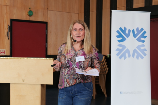 Erla Olsen, dekanur og lektari, helt framløgu um Undirvísingarligar og tøkniligar avbjóðingar við fjarundirvísing