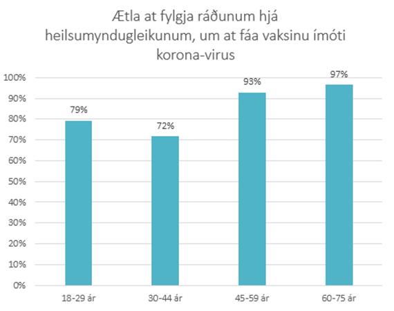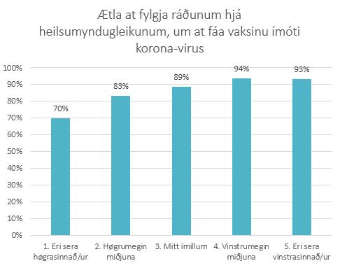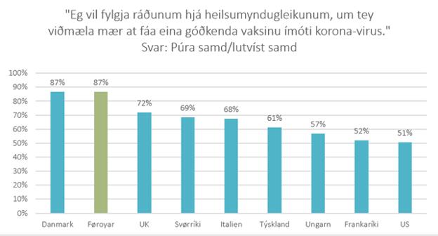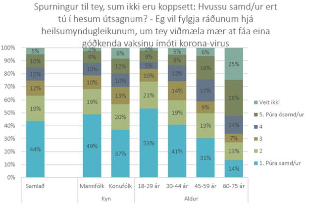 Kanningin spurdi eisini tey, sum ikki eru koppsett enn, um tey ætla at fylgja ráðunum hjá heilsumyndugleikunum, um ein góðkend vaksina verður viðmæld. Her svara umleið 20 prosent, at tey antin eru púra ósamd ella lutvíst ósamd í útsøgnini um, at tey vilja fylgja ráðunum hjá heilsumyndugleikunum. Men hetta eru altso bara 20 prosent av teimum, sum ikki eru koppsett enn.