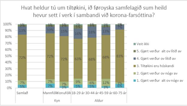 Mynd 1 vísir, at ein stórur meiriluti (umleið 70 prosent) svarar, at tiltøkini ímóti koronufarsóttini hava verið hóskandi. Síðani halda tveir minnilutar upp á góð 10 prosent, at føroyska samfelagið antin hevur gjørt ov nógv ella ov lítið av.