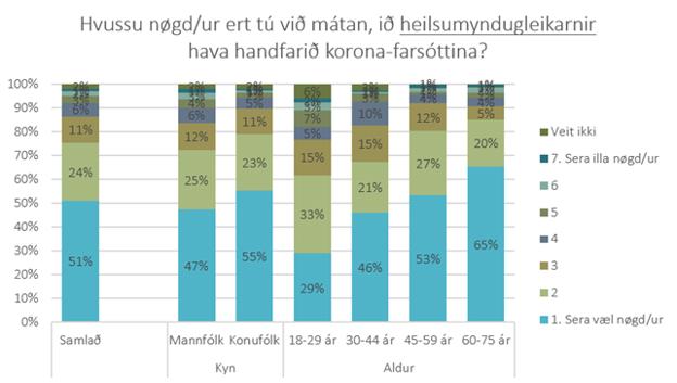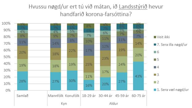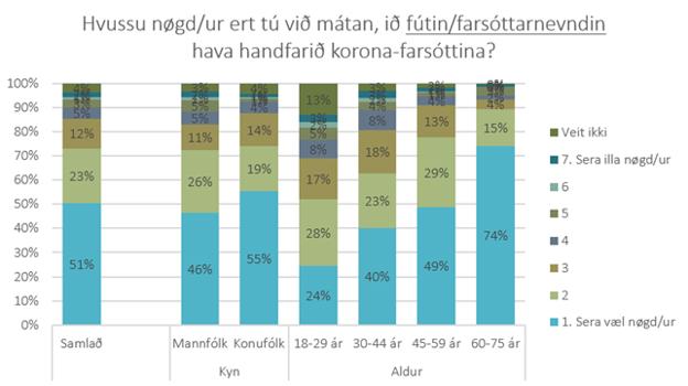 Kanningin spyr eisini, hvussu nøgdir føroyingar eru við háttin, sum ymiskir partar hava handfarið koronufarsóttina. Her fáa bæði heilsumyndugleikar, farsóttarnevndin og Føroya landsstýrið sera góð skoðsmál frá føroyingum. Tó fáa heilsumyndugleikarnir og farsóttarnevndin betri skoðsmál enn Føroya landsstýri.