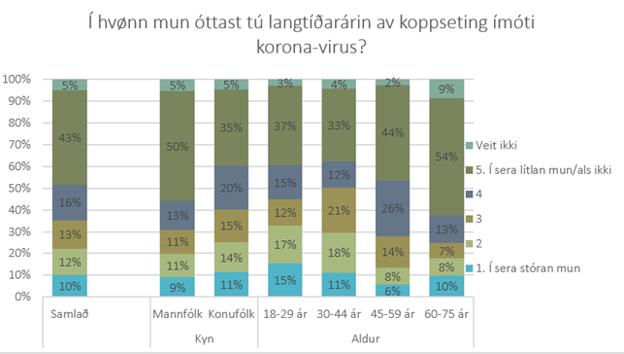 Ein annar spurningur snýr seg um langtíðarárin av koppseting fyri koronu. Her siga góð 20 prosent, at tey í stóran mun ella í ávísan mun bera ótta fyri negativum avleiðingum í longdini. Í sambandi við hendan spurninginin er óttin størstur millum tey ungu í aldrinum frá 18-29 ár.