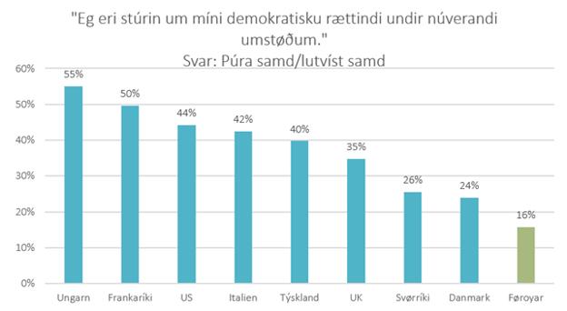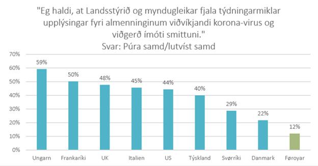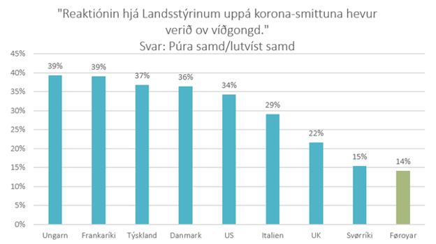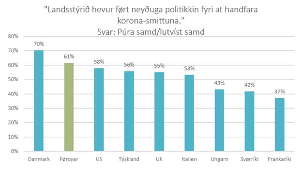 Sum sagt, so eru nakrir spurningar settir í átta ymiskum londum aftrat Føroyum í mai og juni í 2021. Úrslitini niðanfyri vísa nøgdina av teimum, sum svara, at tey antin eru púra samd ella lutvíst samd í útsagnunum í talvunum niðanfyri. Talvurnar vísa, at ein meirluti upp á umleið 60 prosent heldur, at landsstýrið hevur ført neyðuga politikkin fyri at handfara koronusmittuna. Harumframt halda lutfalsliga fá (12-16 prosent), at tey hava orsøk til at stúra fyri sínum demokratisku rættindum; at myndugleikarnir fjala upplýsingar um koronu; ella at tiltøkini ímóti koronu-smittuni hava verið ov víðgongd. Svarini til hesar spurningar vísa, at føroysku tølini eru tey lægstu í allari kanningini.