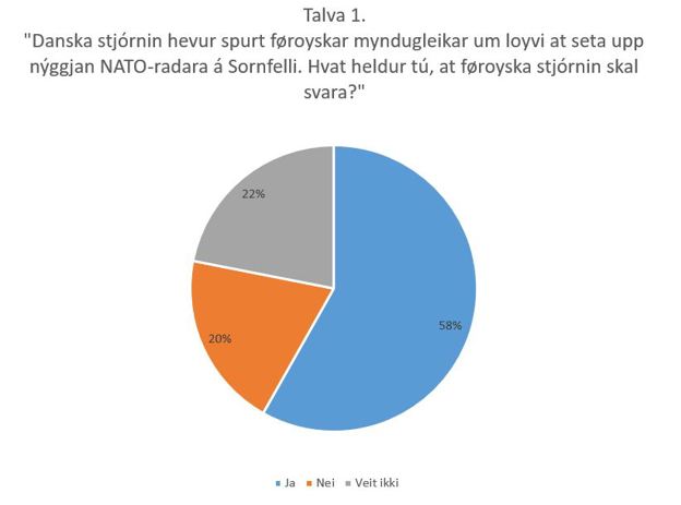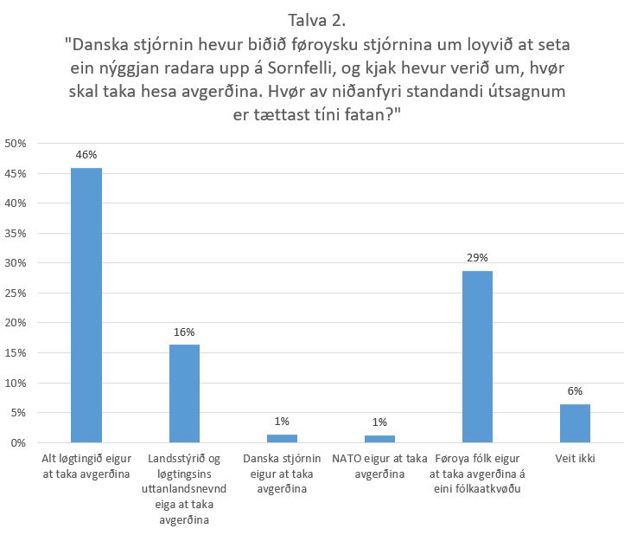 Ein greiður meiriluti av føroyingum tekur undir við, at Føroya Landsstýrið sigur ja til at byggja nýggjan radara á Sornfelli. Men bara 16 prosent taka undir við ætlanini um, at Løgtingsins Uttanlandsnevnd skal taka avgerðina einsamøll, soleiðis sum Landsstýrið hevur boðað frá.