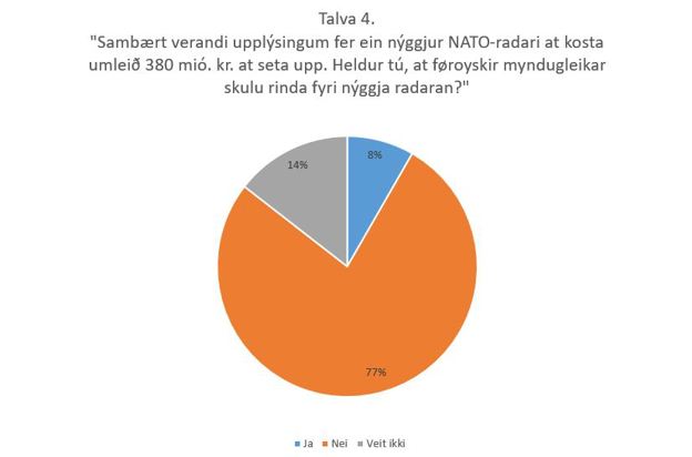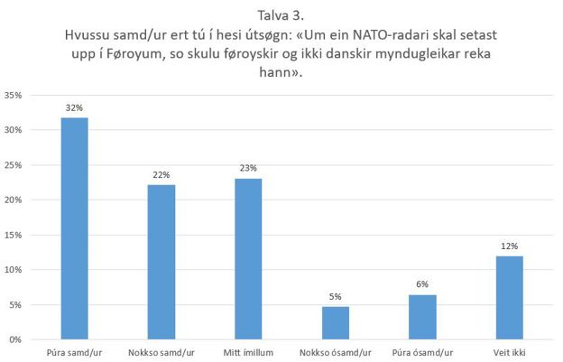 Kanningin vísir eisini, at ein meiriluti upp á 54 prosent siga seg antin vera púra samd ella lutvíst samd í útsøgnini um, at føroyingar skulu reka radaran. Men tey allar fægstu (6 prosent) halda, at føroyingar skulu rinda fyri radaran.