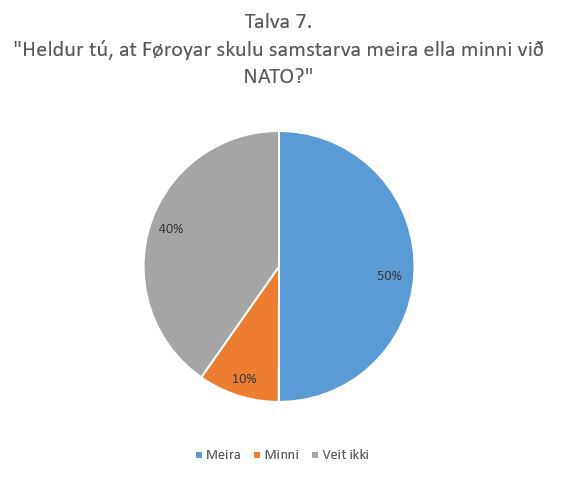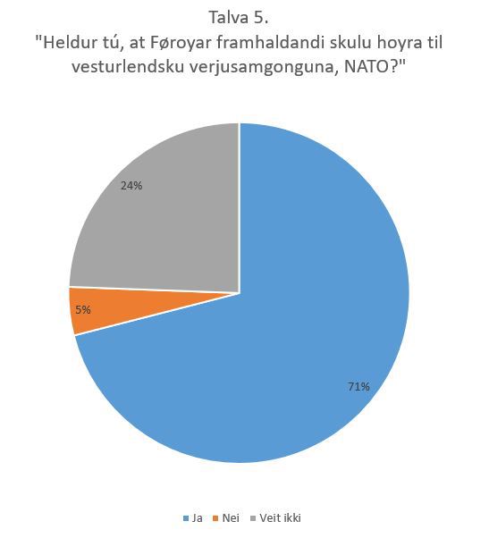 Kanningin vísir eisini, at ein stórur meiriluti av føroyingum (71 prosent) heldur, at Føroyar skulu hoyra til vesturlendsku verjusamgonguna, NATO. 59 prosent uppfata NATO sum ein positivan felagsskap, og helvtin heldur, at Føroyar áttu at samstarva meiri við NATO.