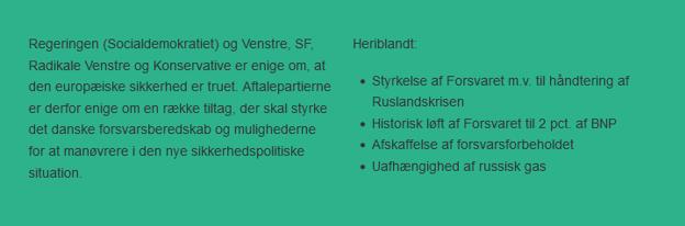 Við tjóðarsemjuni um trygdarpolitikk, sum Sosialdemokratarnir, Vinstriflokkurin, SF, Radikali Vinstri og Konservativi Fólkaflokkurin gjørdu í mars 2022, varð avrátt, at Danmarkar útreiðslur til verju og trygd skulu vaksa upp í tvey prosent av danska BTÚ fyri árslok 2033, og at núverandi trygdarpolitiska støða við álopskrígnum hjá Russlandi krevur 3.5 milliardir krónur eyka í ár og næsta ár til m.a. økta tilbúgving. Partur av tjóðarsemjuni var somuleiðis fólkaatkvøða um at strika verjufyrivarnið hjá Danmark í ES-høpi, og tað gjørdu donsku veljararnir tann 1. juni í ár.