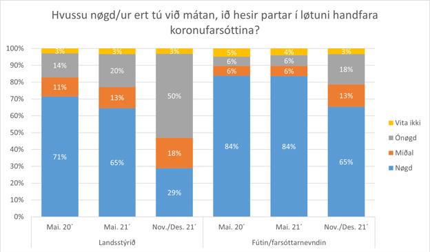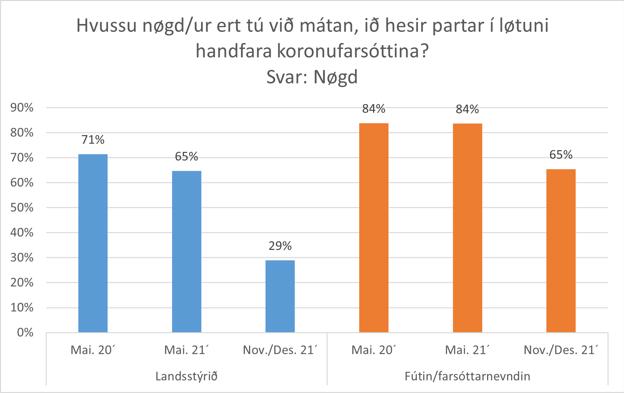 Í talvu 2 og 3 sæst, hvussu nøgdsemið við Landsstýrið og Farsóttarnevndina hevur verið í trimum kanningum (mai 2020, mai 2021 og november/desember 2021).