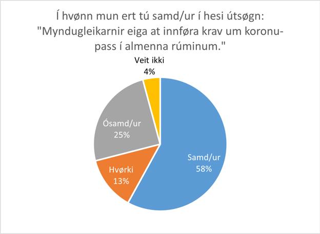 Kanningin hevði eisini til endamáls at kanna, hvønn hugburð fólk hava til koronupassið, sum nú er sett í verk. Í hesum sambandi tekur ein meiriluti á 58 prosent undir við útsøgnini um, at myndugleikar eiga at krevja koronupass í almenna rúminum. 25% prosent eru ósamd í hesi útsøgn (talva 4).