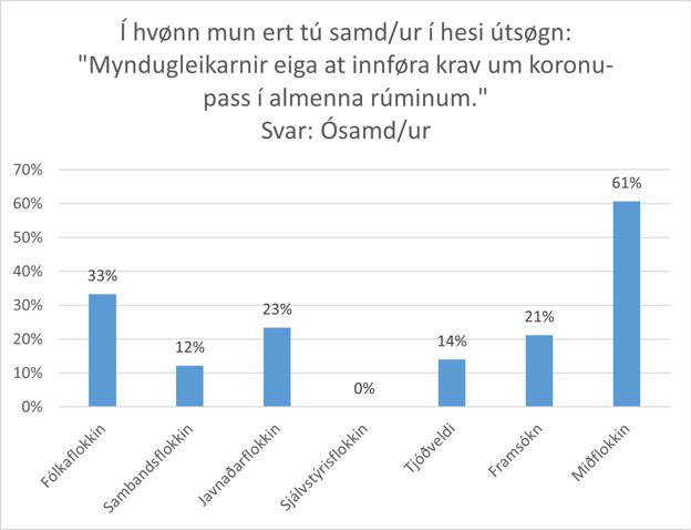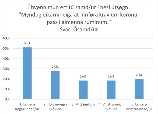 Í talvu 5, 6 og 7 niðanfyri er yvirlit yvir tey, sum eru ímóti koronupassinum býtt á flokkar og politiska hugsjón. Hetta er gjørligt, tí allir luttakarar í kanningini vórðu bidnir um at svara, hvønn tey høvdu atkvøtt fyri, um val var í dag, og allir luttakarar skuldu eisini taka støðu til, hvar tey meta seg liggja á einum høgra-vinstra ási og einum ási, sum snýr seg um konservativ ella liberal virðir. Talvurnar niðanfyri vísa, at mótstøðan ímóti koronu-passinum er nógv størst í Miðflokkinum og næst størst í Fólkaflokkinum. Talvurnar vísa eisini, at fólk, sum siga seg vera til høgru og konservativ, í størri mun eru ímóti koronupassinum.