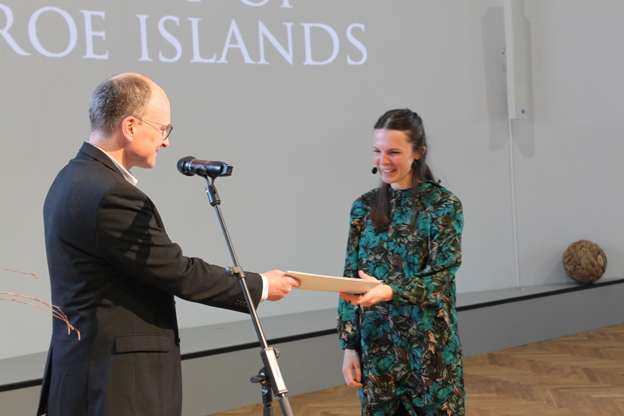 Bergur D. Hansen, dekanur á Føroyamálsdeildini handar Rakul MA-prógvið. Hon vísir ikki frá sær møguleikan fyri at granska í føroyskum máli