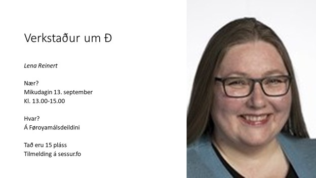 Lena Reinert á Føroyamálsdeildini fer 13. september frá klokkan 13:00 til 15:00 at hava verkstað fyri lesandi á Setrinum um Ð, sum kann vera tvørligt hjá mongum at handfara rætt í tekstum.