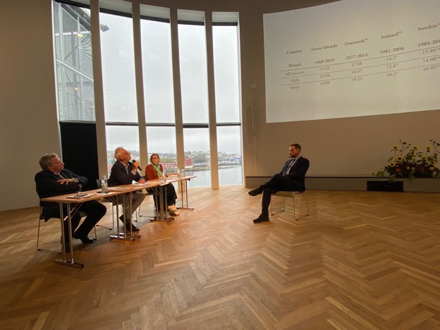 Marnar Fríðheim Kristiansen varð tráðspurdur um gransking sína í ritgerðini, men svaraði væl fyri seg. Við borðið sótu Pál Weihe, professari og formaður í dómsnevndini, Henrik Møller, professari m.a. á Aalborg Universiteti, og Liesbeth Van Eycken, leiðari á krabbameinsskrásetingini í Belgia