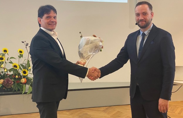 So er verjan staðin. Hans Pauli Joensen, dekanur á Náttúruvísindadeildini, handar Marnari blómur og ph.d.-prógv frá Fróðskaparsetri Føroya
