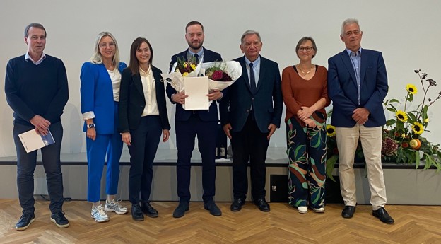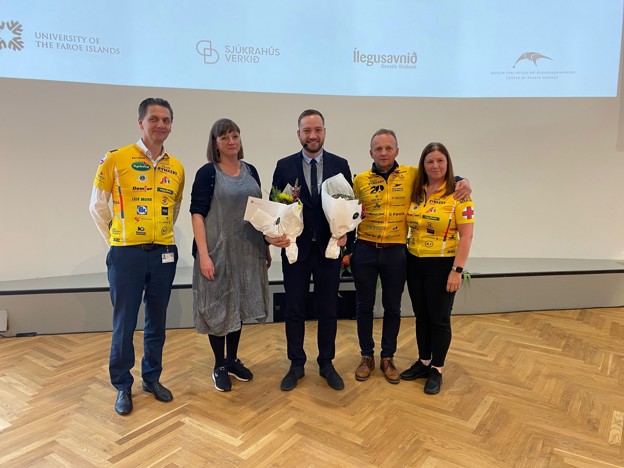Bjarni á Steig, yvirlækni og hjálparvegleiðari, saman við vegleiðarum, formanni og andmælingum. Í miðjuni nýggi ph.d.-arin við blómum og prógvi