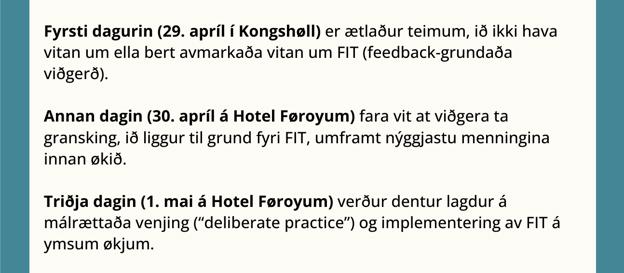 Høvuðsdenturin verður lagdur á feedback-grundaða viðgerð (FIT), ið m.a. er ein háttur at góðskutryggja og betra um úrtøkuna av samrøðuviðgerð.